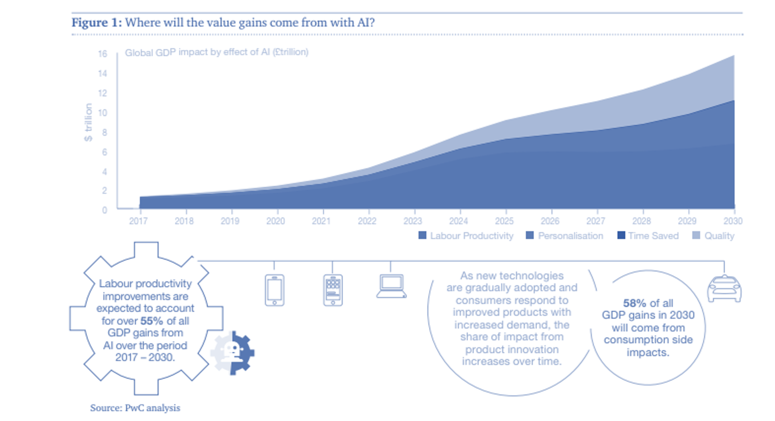 So as AI is adopted, who stands to gain the most? A recent PWC report into the potential of AI predicts that AI will create $6.6 trillion of value in increased productivity in 2030 (and contribute $15.7 trillion to the global economy overall). You can view their breakdown of predicted value creation below: