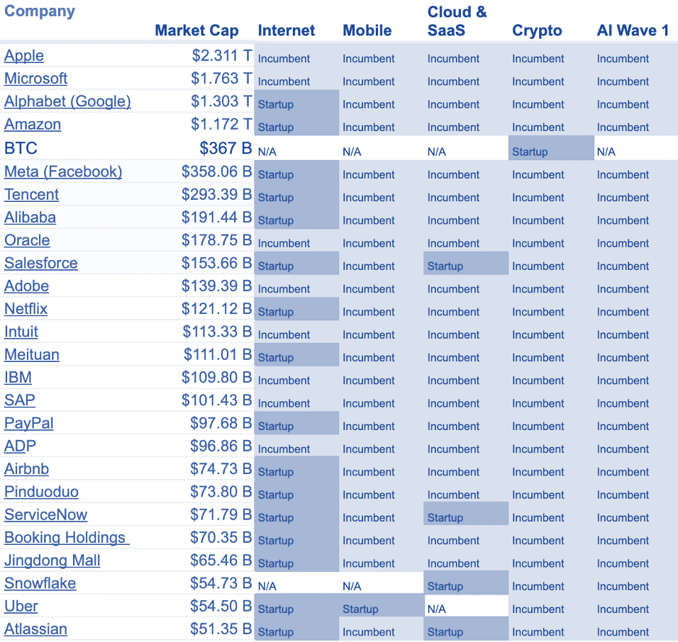What’s more, as the table below shows, where industries have existing incumbents in a similar or compatible technology, they can go on to dominate markets:
